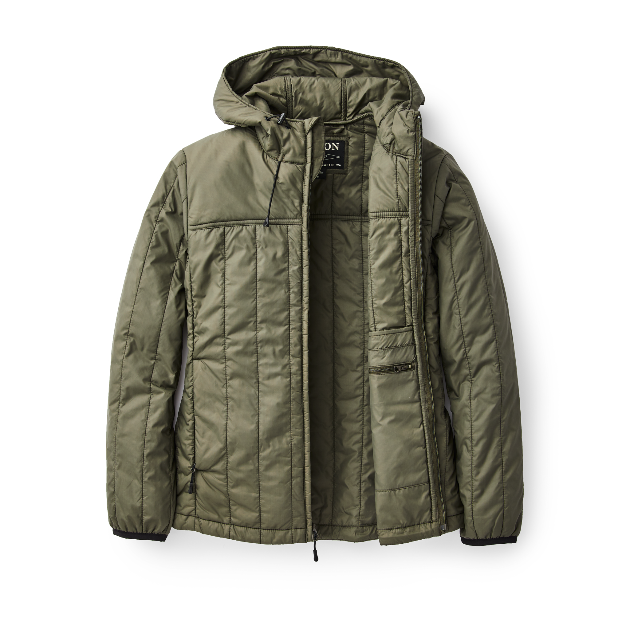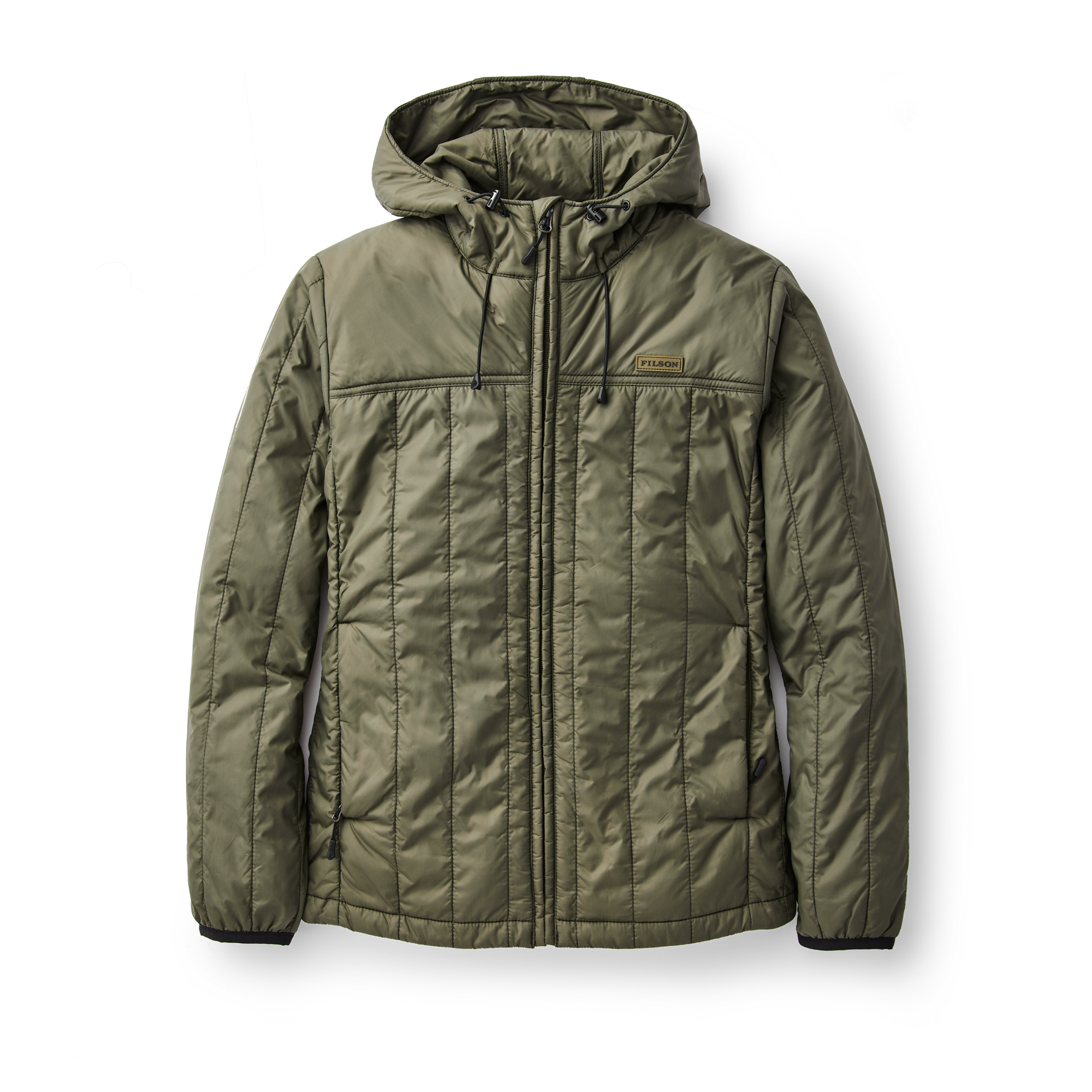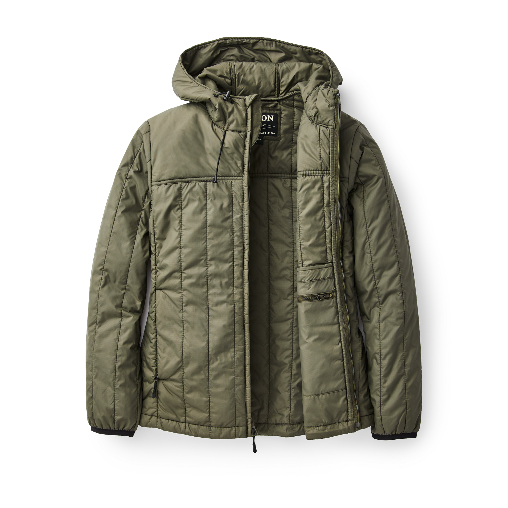 Offering our highest warmth-to-weight ratio synthetic insulation, the Filson Women’s Ultra-Light Hooded Jacket is constructed from 60g Primaloft Gold insulation covered by a lightweight ripstop shell to pack small and insulate even when wet. Features a full-length zipper, zippered handwarmer & interior security pockets, and reinforced shoulder paneling for durability.
